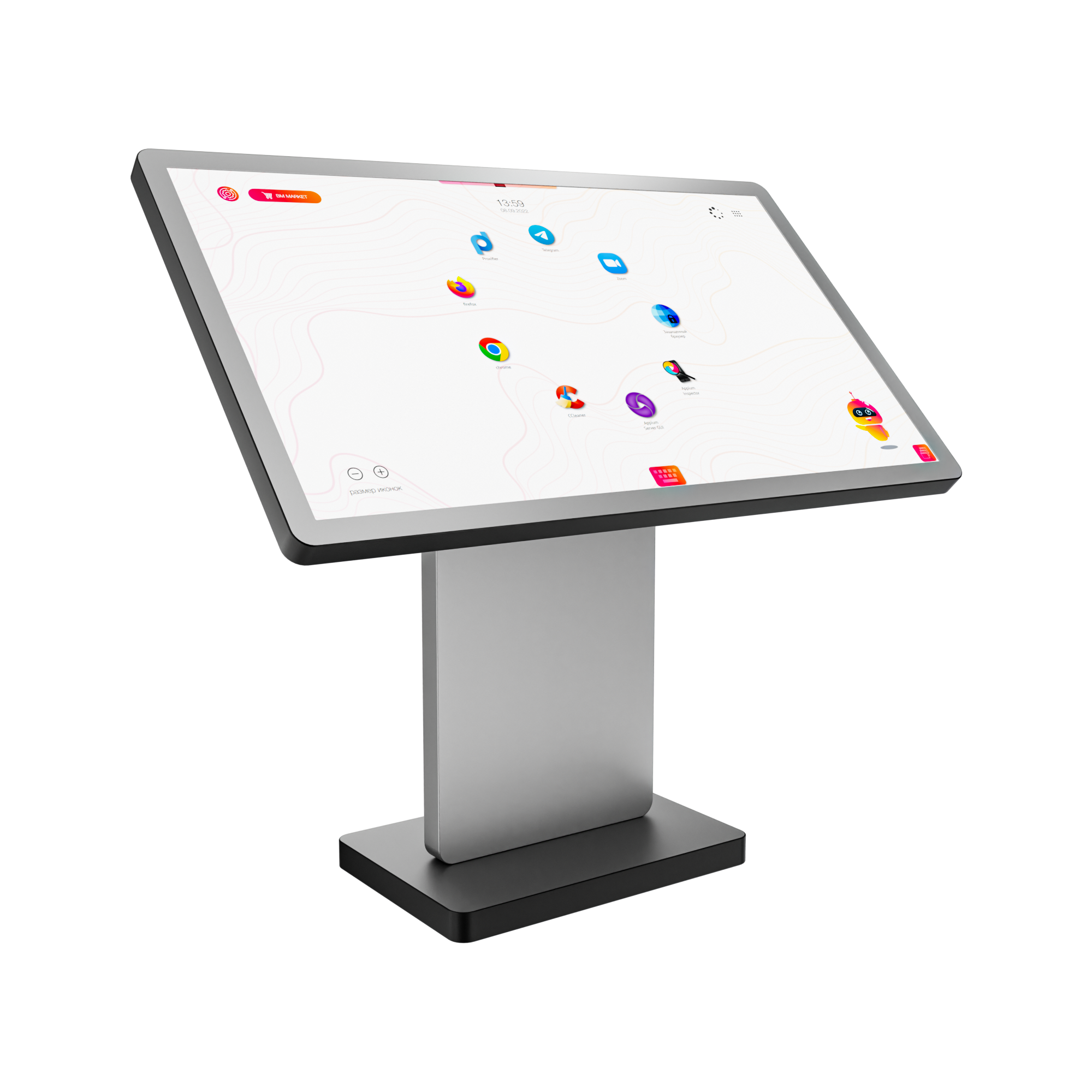 - Горизонтальный сенсорный экран высокой четкости — яркий дисплей Full HD, встроенный в прочную столешницу, обеспечивает комфортную горизонтальную поверхность для взаимодействия. Технология мультитач поддерживает множество одновременных касаний, позволяя нескольким пользователям одновременно рисовать, перемещать объекты и взаимодействовать с контентом, развивая навыки командной работы.