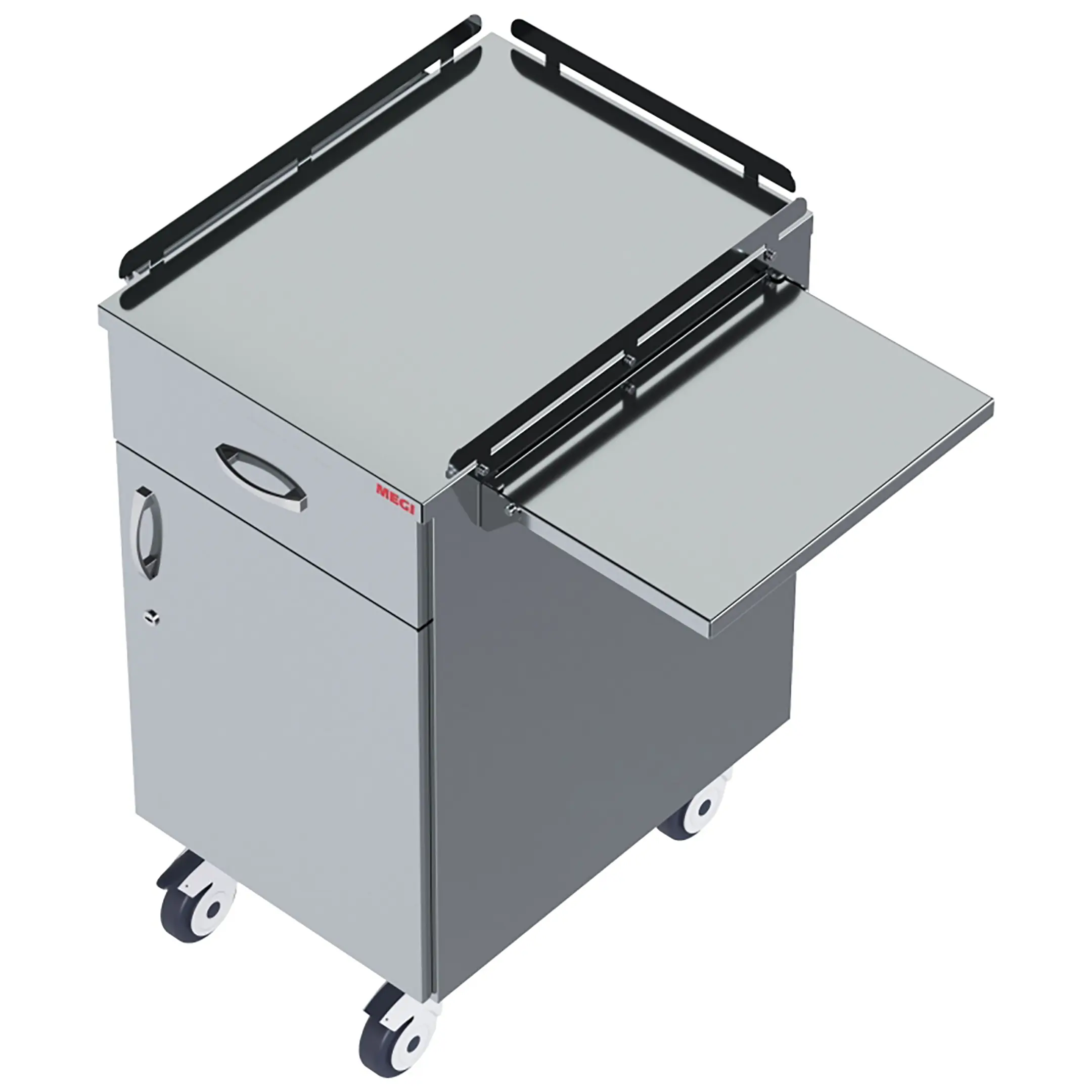 • колеса поворотные, самоориентирующиеся, диаметром 100 мм, комплектуются надёжной стальной вилкой с прецизионным радиально-упорным подшипником, ободом из полипропилена и шинкой из серого полиуретана, не оставляющего следов на полу, два колеса – с индивидуальным тормозным устройством;