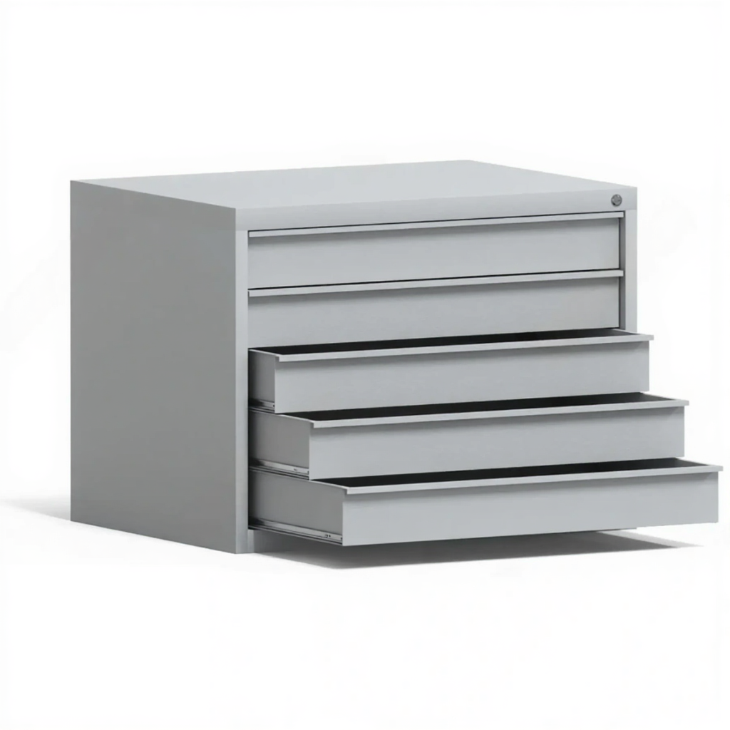 - Прочная промышленная конструкция — шкаф изготовлен из усиленной стали, рассчитанной на значительный вес больших форматов бумаги. Конструкция устойчива и долговечна, что позволяет безопасно хранить даже тяжелые подрамники или планшеты с натянутыми оригиналами.