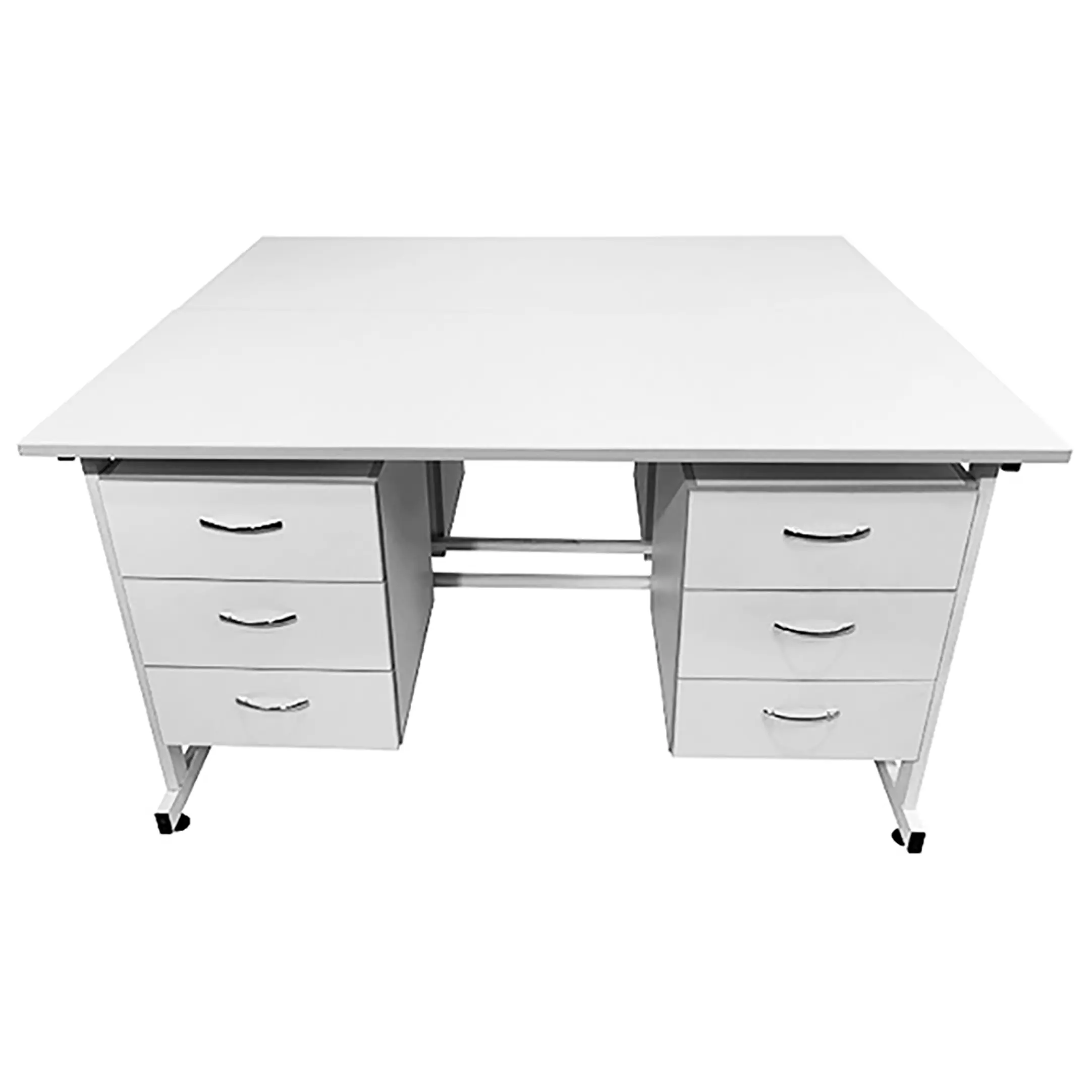 Стол лабораторный островной Сло 22.005 (белый) — это идеальное решение для организации двух рабочих мест в лаборатории, медучреждениях или других подобных местах. Модель поможет максимально эффективно использовать пространство помещения благодаря своей функциональности. Каждое рабочее место оборудовано двумя подвесными тумбами, каждая с тремя выдвижными ящиками. Каркас выполнен из стального профиля, столешницы из ЛДСП толщиной 22 мм.