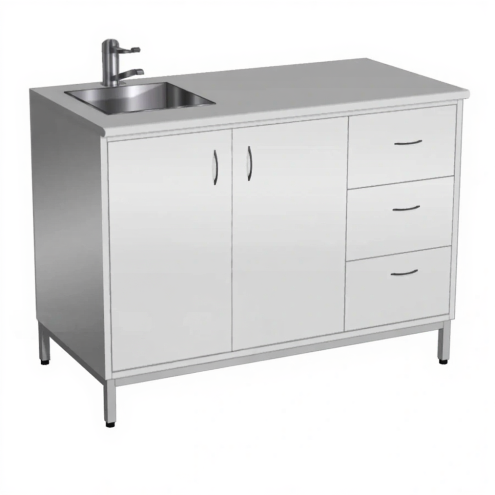Стол-мойка СТм-108 «Стандарт» 1200 (корпус металл серый, столешница постформинг серый, каркас серый) — это необходимая составляющая для оснащения рабочей зоны, обеспечивающая удобство и безопасность труда специалистов-исследователей в кабинетах лабораторий. Модель предназначена для мытья и сушки лабораторной посуды. Оснащена одночашевой врезной мойкой из нержавеющей стали, локтевым смесителем и комбинированной системой хранения: в левом отделении две дверки, в правом — три выдвижных ящика. Каркас выполнен из стального профиля, корпус из стального листа с полимерно-порошковым покрытием, столешница из постформинга 28 мм.