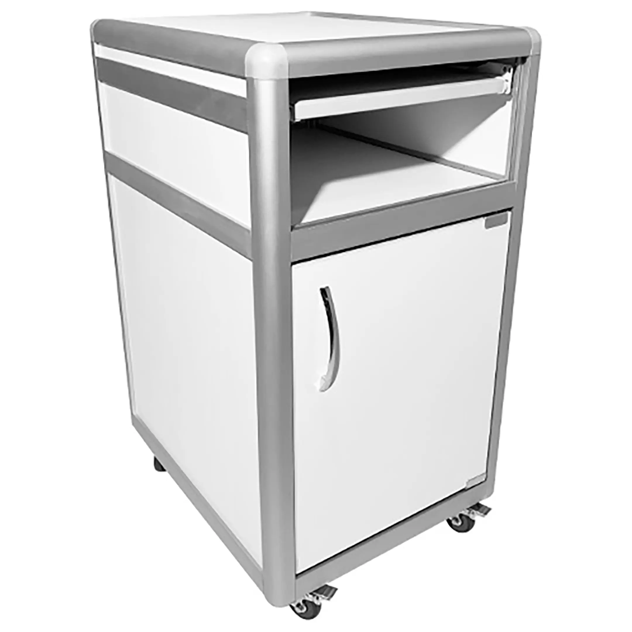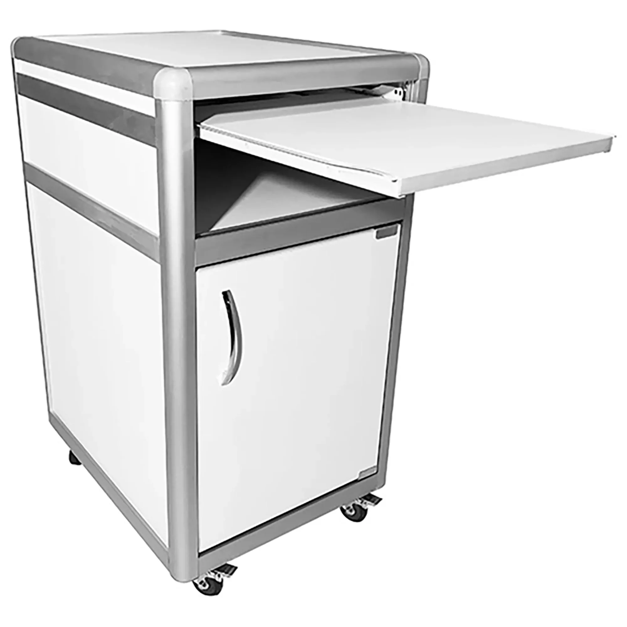 - Функциональная организация — выдвижная полка, открытая ниша и отделение с распашной дверкой и полкой для удобного хранения.