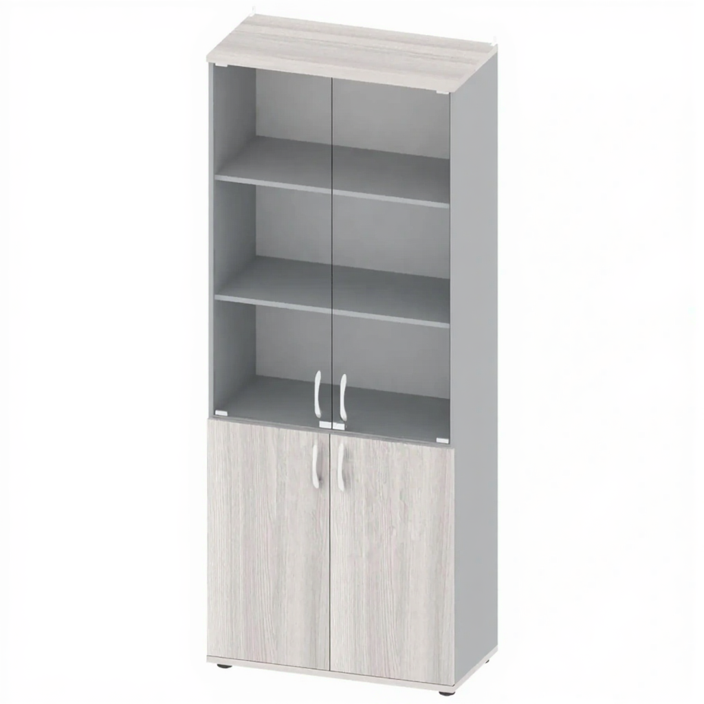 - Комбинированное остекление — два отделения со стеклянными дверками для демонстрации содержимого и одно с глухими для хранения материалов, не требующих обзора.