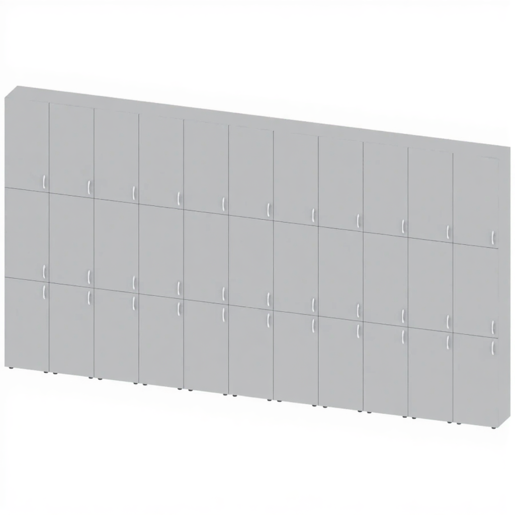 Шкаф многосекционный встраиваемый закрытый ШК-ТР-8, Серый — это функциональное решение для хранения вещей в образовательных, офисных, административных и других учреждениях. Модель представляет собой встраиваемую конструкцию с несколькими секциями, изготовленную из качественной ЛДСП серого цвета с обработкой торцевых частей кромочной лентой ПВХ.