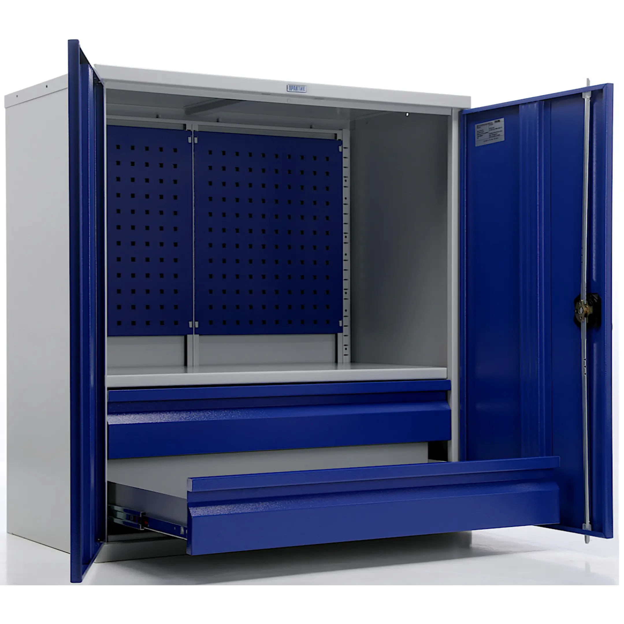 - Надежная защита инструментального парка — цельнометаллический корпус с запирающимися на общий замок дверями обеспечивает высокий уровень безопасности. Это защищает содержимое от краж, несанкционированного доступа, а также от пыли, грязи, стружки и влаги, характерных для производственной среды.