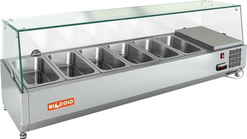 Описание Охлаждаемая витрина настольного типа HICOLD VRTG 2 со стеклянной надстройкой создаст эффектную презентацию готовой продукции: пиццы, бутербродов, салатов, охлажденных блюд, закусок, десертов в заведениях общепита или на выездном фуршете. Витрина с регулируемыми ножками устанавливается на стол для пиццы PZ3-11/GN, в отдельные емкости укладываются различные ингредиенты и начинки. С помощью холодильной витрины со стеклом можно ознакомить покупателей с ассортиментом, привлечь внимание к определенной категории продуктов. Модель оснащена системой статического охлаждения, электронным термостатом, цифровым дисплеем. Стальной корпус не подвержен коррозии, верхняя часть выполнена из прямого стекла. Особенности Корпус из стали AISI 304 Стеклянная надстройка Электронная панель управления Гравитационный тип охлаждения Экономичный компрессор Термоконтроллер Гастроемкости глубиной 150 мм: 6xGN 1/3