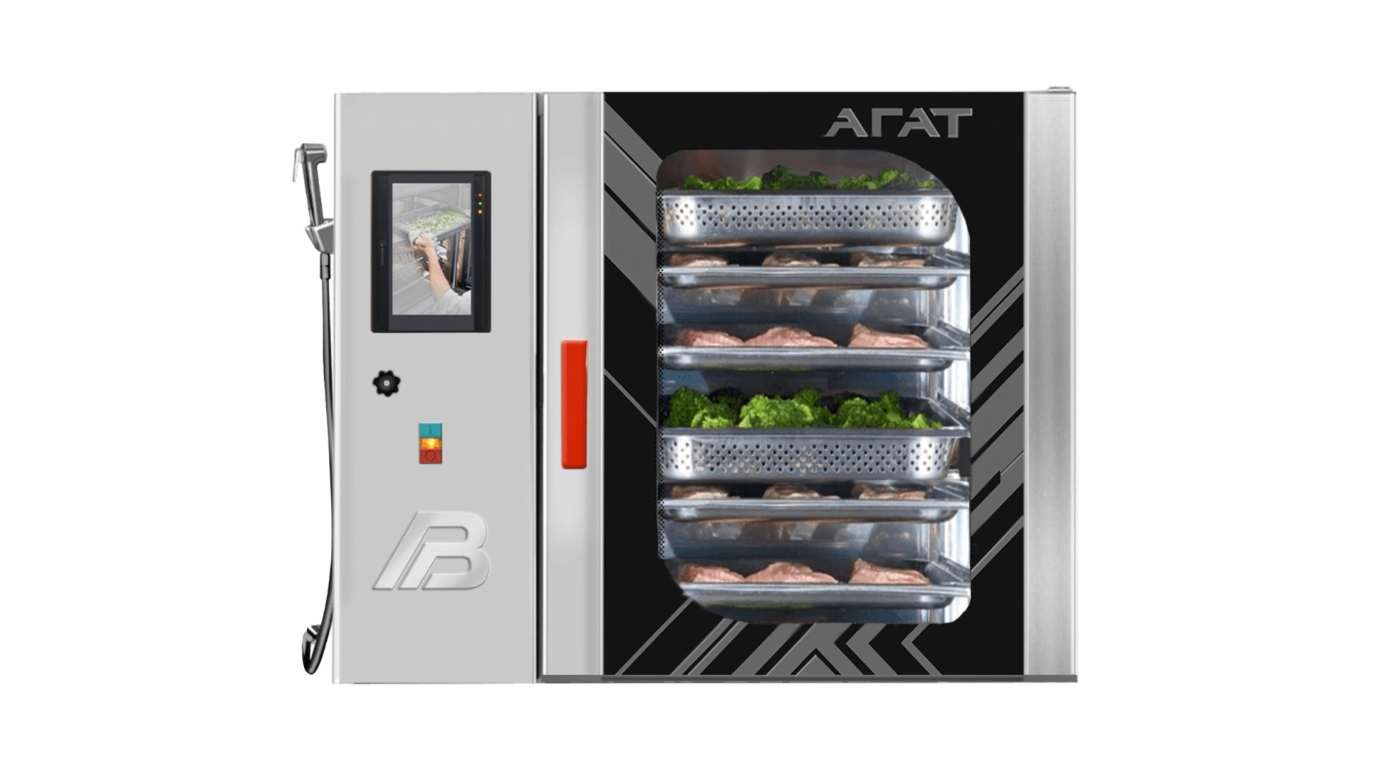 Пар в пароконвектомате образуется при дозированной подаче воды на крыльчатку вентилятора. Алгоритм подачи пара разработан специально для пароконвектоматов «Агат» и позволяет за минимальный промежуток времени достичь в камере максимальной влажности и в дальнейшем постоянно ее поддерживать. В зависимости от температуры в камере и количества пара пароконвектомат может работать в трех режимах: варка на пару, пар с конвекцией и конвекция.