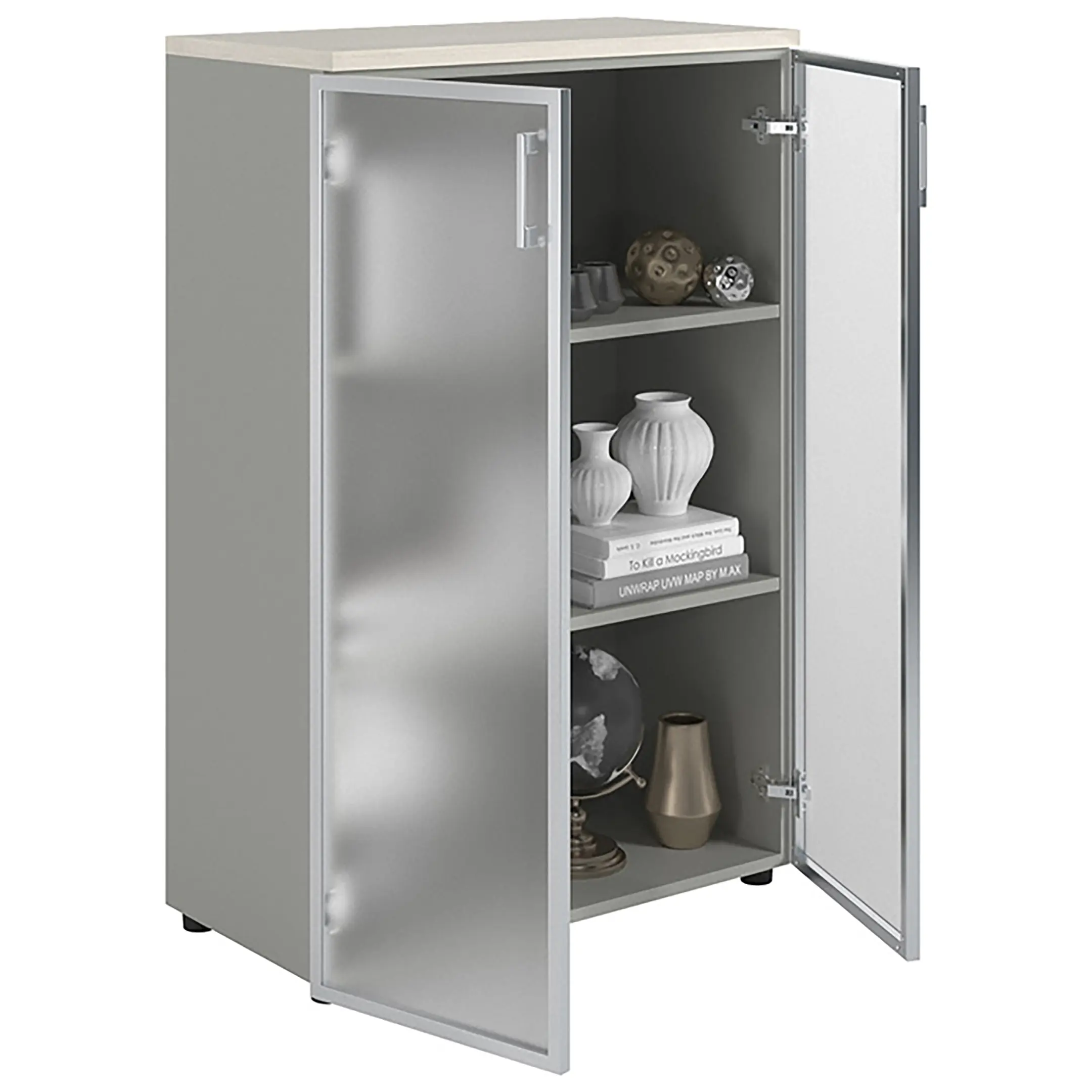Шкаф NW 1280/2G со стеклом белое дерево/серый предназначен для хранения.