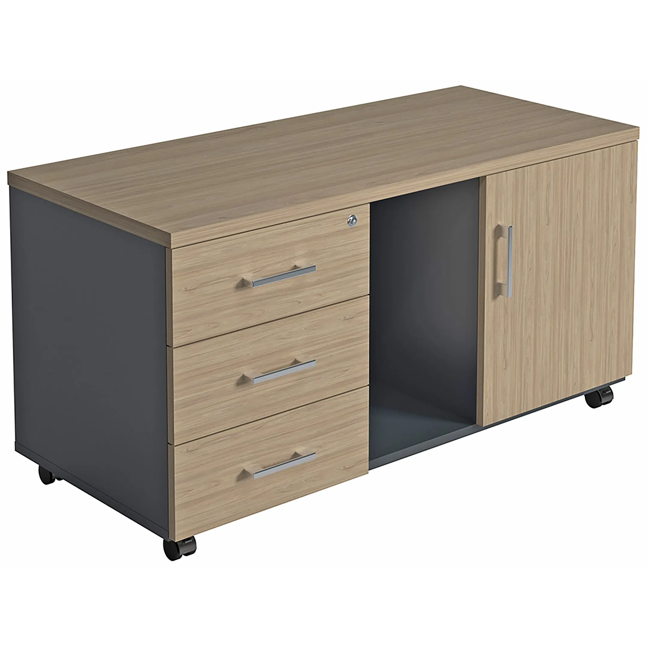 • верхний ящик тумбы снабжен замком и оснащен пластмассовым лотком для канцелярских принадлежностей;