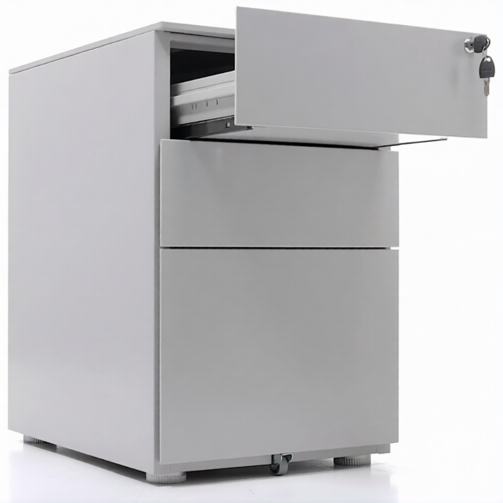 Опции: пластиковые лотки и металлический ящик для канцелярских принадлежностей и других предметов. Возможность комбинирования цветов: корпус + фасады ящиков и крышка (конструкция тумбы металл+металл). Или отделка фасадов ящиков и крыши тумбы ламинированной плитой ЛДСП (конструкция тумбы металл+ЛДСП)