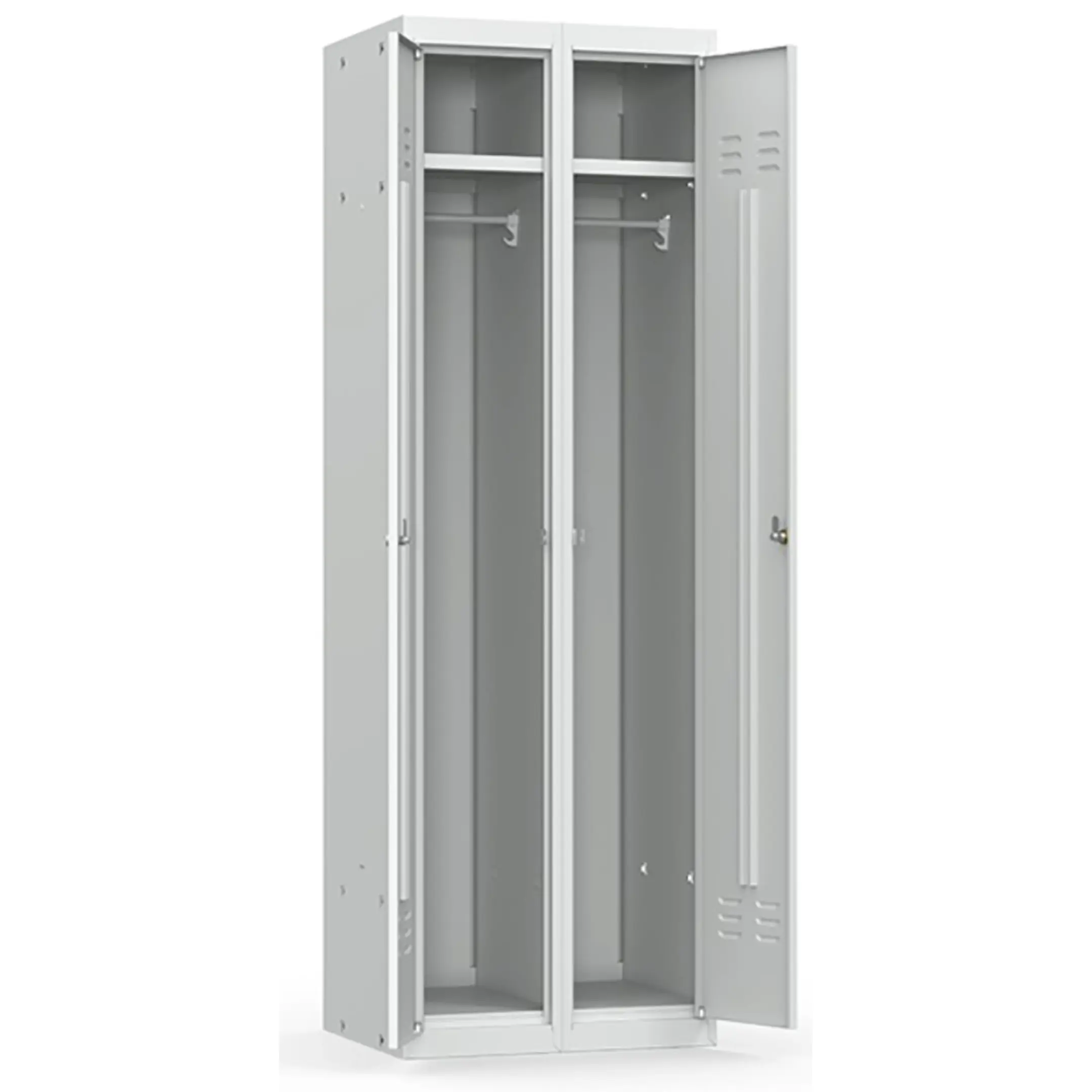• Шкаф имеет две секции, каждая из которых оснащается полкой для головных уборов, пластиковыми перекладиной для вешалок и двумя крючками для одежды, проушиной для навесных замков;