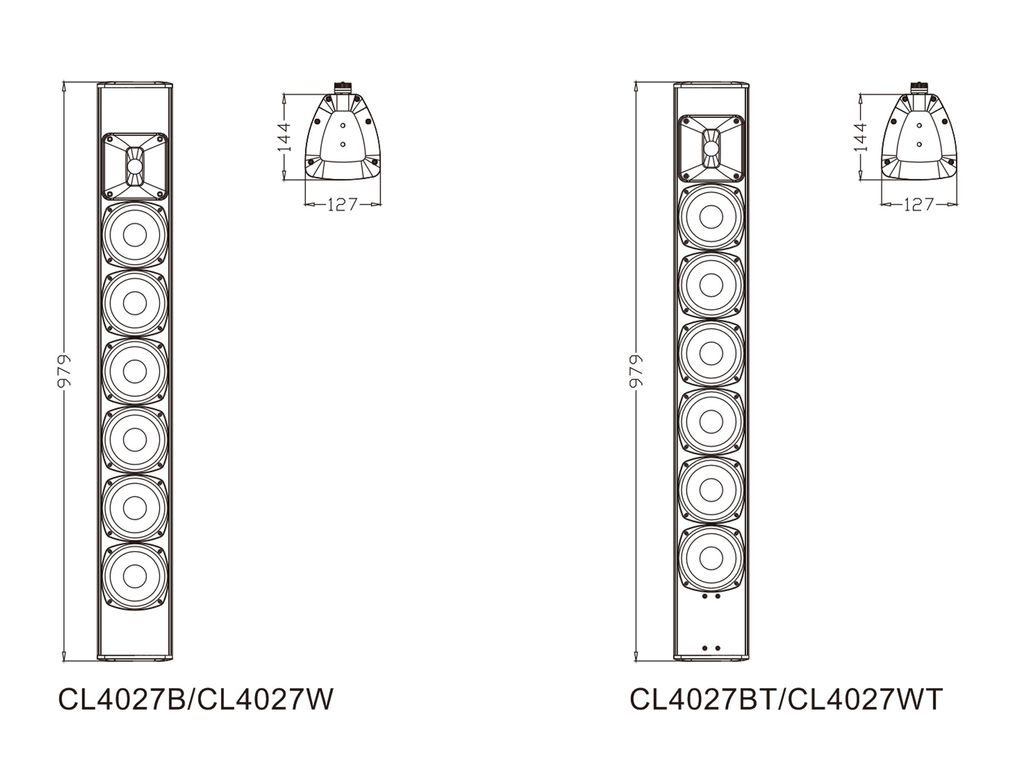 Серия CL4027 представляет собой акустическую систему колонного типа с различными цветами и функциями. Продукт соответствует стандарту IP56. Звук мягкий и сбалансированный. Корпус изготовлен из алюминиевого сплава. Буквы B и W после модели обозначают черный и белый цвет соответственно, а буква T представляет собой конфигурацию с трансформатором.