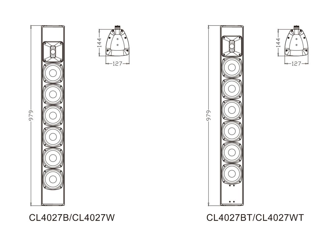 Серия CL4027 представляет собой акустическую систему колонного типа с различными цветами и функциями. Продукт соответствует стандарту IP56. Звук мягкий и сбалансированный. Корпус изготовлен из алюминиевого сплава. Буквы B и W после модели обозначают черный и белый цвет соответственно, а буква T представляет собой конфигурацию с трансформатором.
